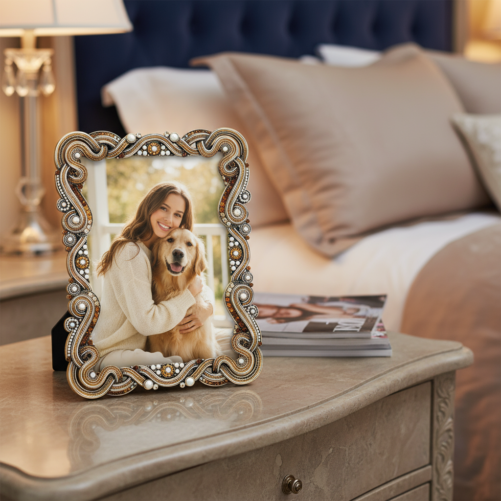 Cast pewter picture frame in bronze finish with dozens of hand-set European crystals, tiger’s eye and faux pearls. Elegant moiré silk back with easel for vertical or horizontal placement. Tarnish resistant. Signature luxury gift box included.