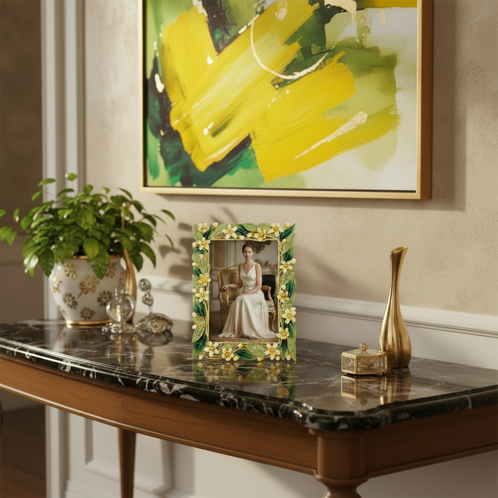 Gold finished pewter picture frame featuring frangipani blossoms and leaves, intricately hand-enameled in white, yellow, and green hues. Encrusted with hand-set clear and peridot European crystals. Elegant champagne moiré silk back, with easel designed for vertical or horizontal placement. Tarnish resistant. Signature luxury gift box included.