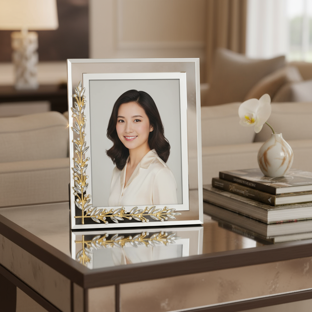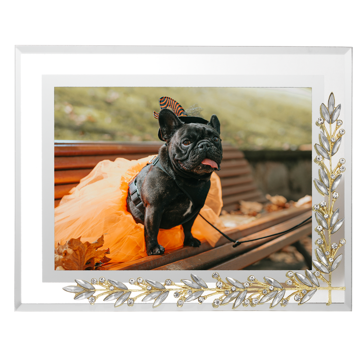Silver edged beveled glass picture frame with laurel patterned gold or silver finished pewter embellishment. Hand-set clear European crystals and marquise cut glass gems. Moiré silk back with easel designed for vertical or horizontal placement. Tarnish resistant. Signature luxury gift box included.