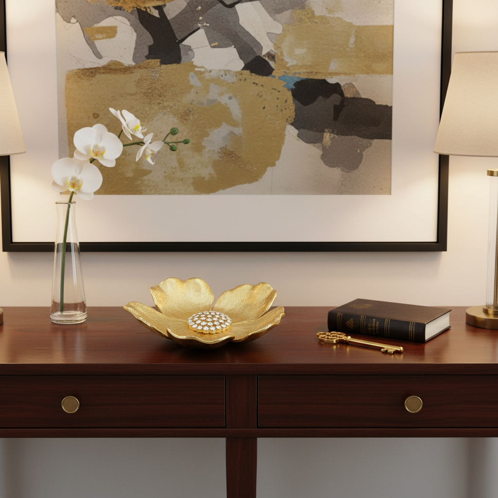 Beautiful sculptural flower, inspired by the Rugosa Rose. Gold or silver finished pewter catchall tray with hand-set clear European crystals. Tarnish resistant. Signature luxury gift box included.