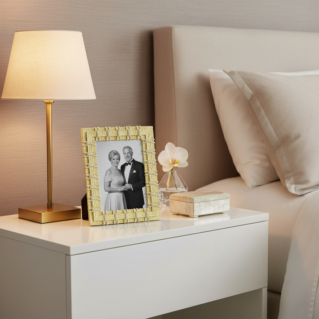 Texturized silver or gold finished pewter picture frame with banding, heavily encrusted with rows of hand-set clear pavé European crystals. Elegant moiré silk back, with easel designed for vertical or horizontal placement. Beveled glass. Tarnish resistant. Signature luxury gift box included.
