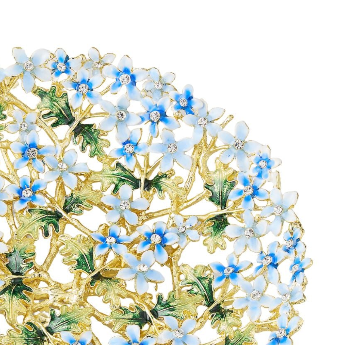Enchanting gold finished pewter floral patterned catchall dish / candy dish, hand-enameled in serene blue and green hues. Hand-set clear European crystals. Tarnish resistant. Signature luxury gift box included.
