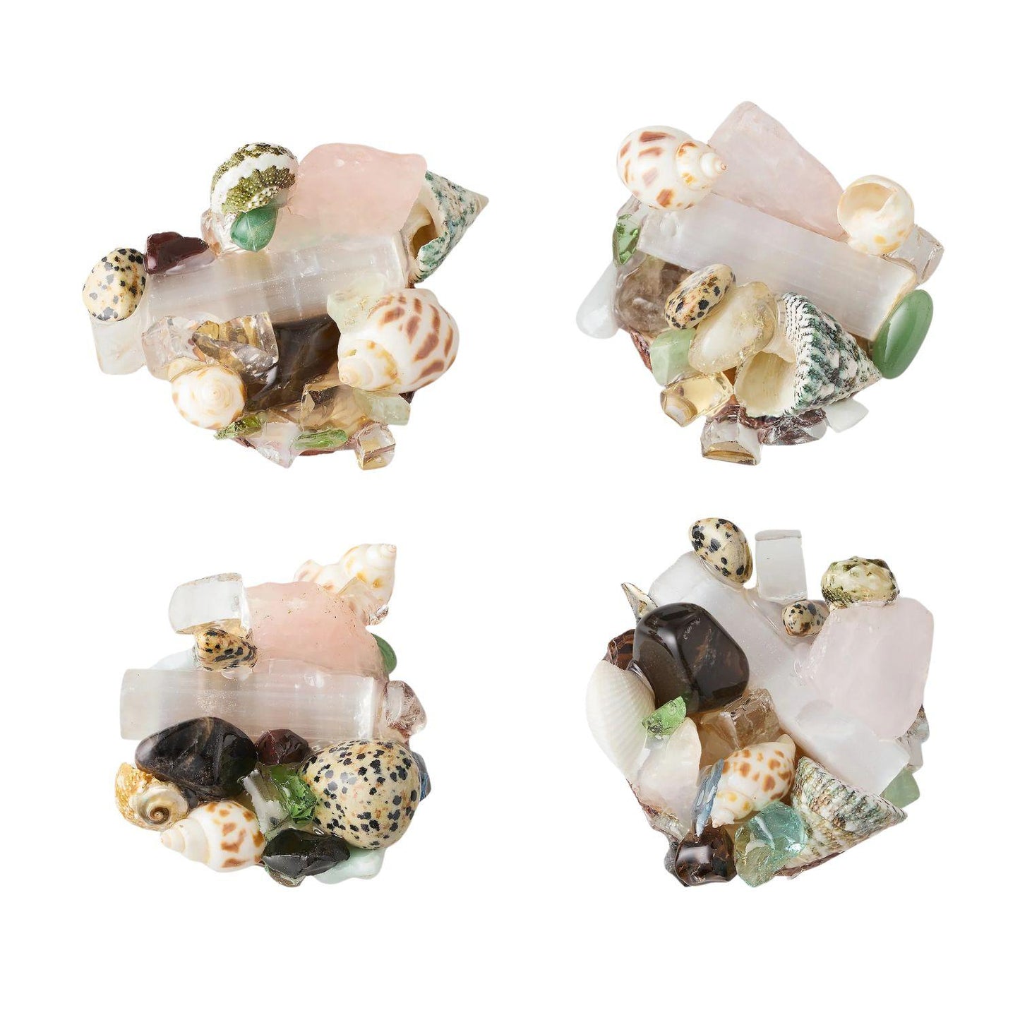 The Coastal pattern's multi-colored adornment includes a selection of glass, sea shells, and natural minerals, such as, clear quartz, rose quartz, selenite, aventurine, and jasper. Dust bag included.