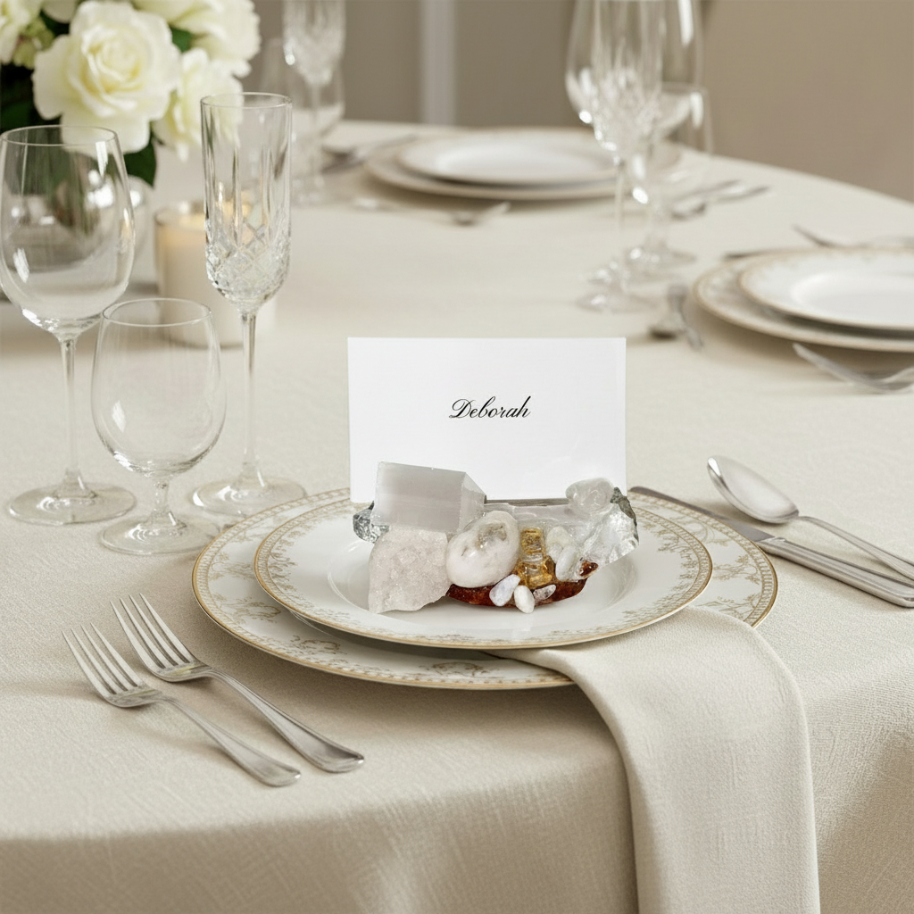Blending beauty with function, each place card holder is handmade in Texas from rich black walnut, hand-lacquered with a clear non-porous food-safe resin, and adorned with glass and natural minerals.