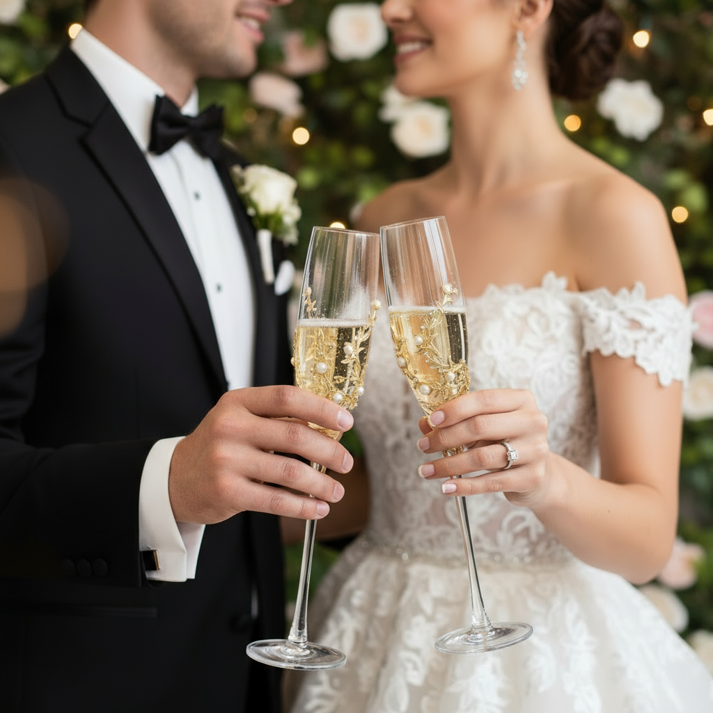 Glass stemmed champagne flutes, wrapped with gold or silver finished pewter adornment. Encrusted with hand-set clear European crystals and faux pearls. Glass can be acid etched. Hand-wash. Signature luxury gift box included.