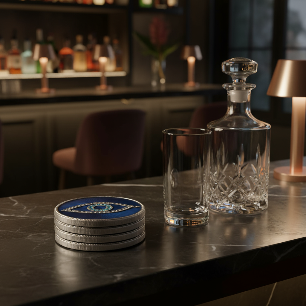 Silver finished cast pewter evil eye coaster with blue guilloche style hand-enameling and hand-set gray and light sapphire European crystals. Black velvet scratch resistant underside. Signature luxury gift boxed set of 4 coasters. Tarnish resistant.