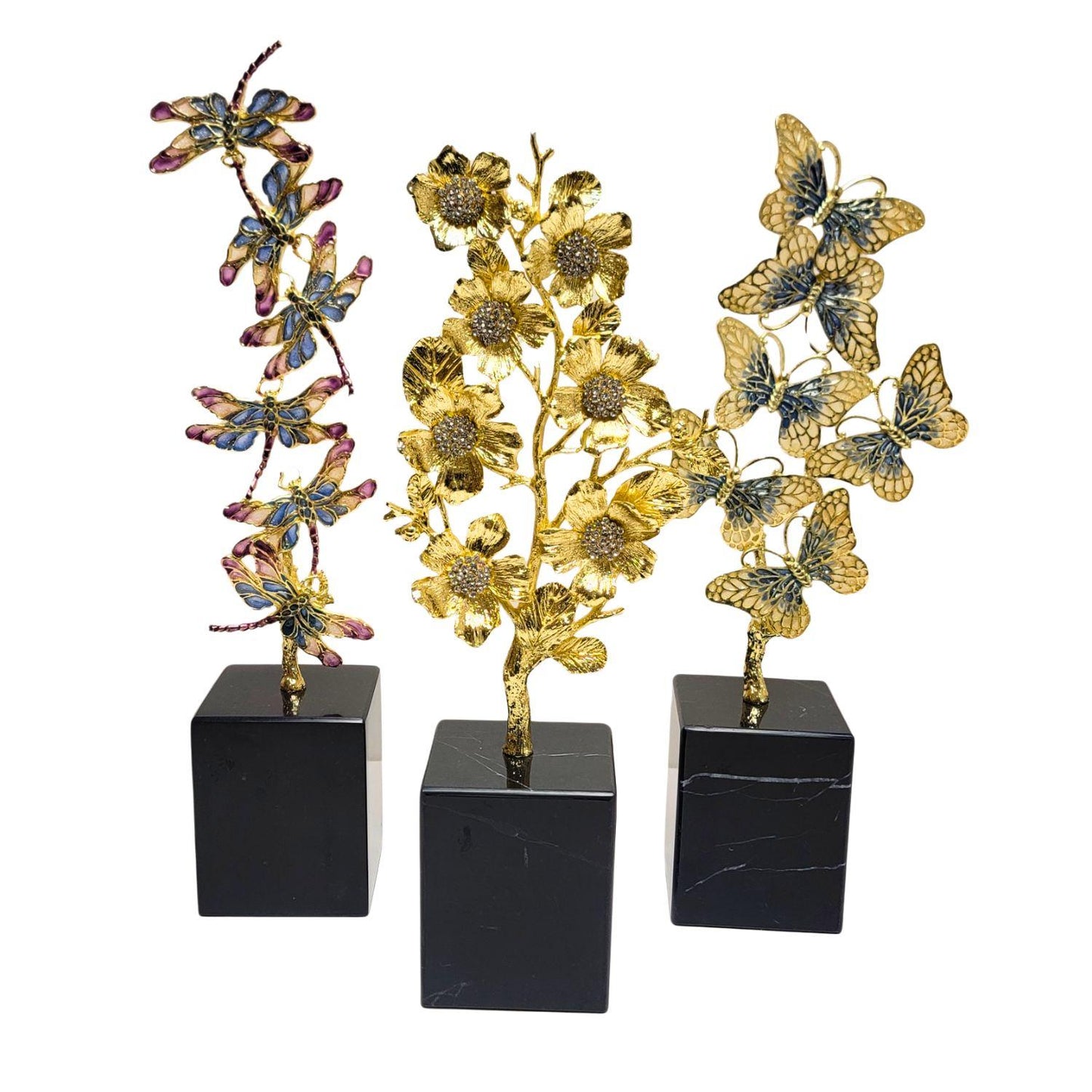 Depicting the fluttering movements of a butterfly kaleidoscope, this sculpture is richly cast by artisans in a gold finished pewter and hand-enameled in translucent cerulean blue and pearl hues. Mounted on an elegant black marble base. Tarnish resistant. Signature luxury gift box included.