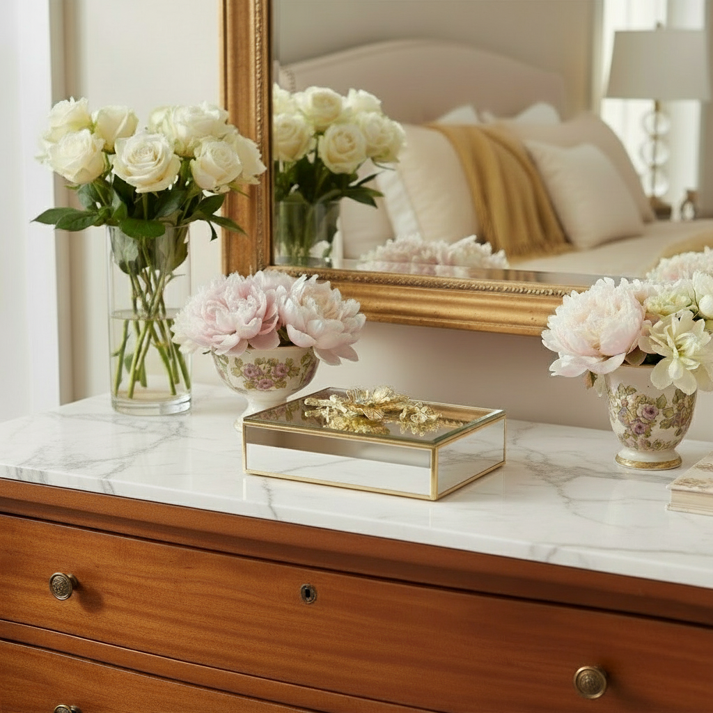 Beveled mirrored glass box with gold or silver finished pewter floral adornment, inspired by the beautiful Rugosa Rose. Encrusted with hand-set clear European crystals. Hinged Lid. Black velvet lined interior. Gray moiré silk underside. Tarnish resistant. Signature luxury gift box included.