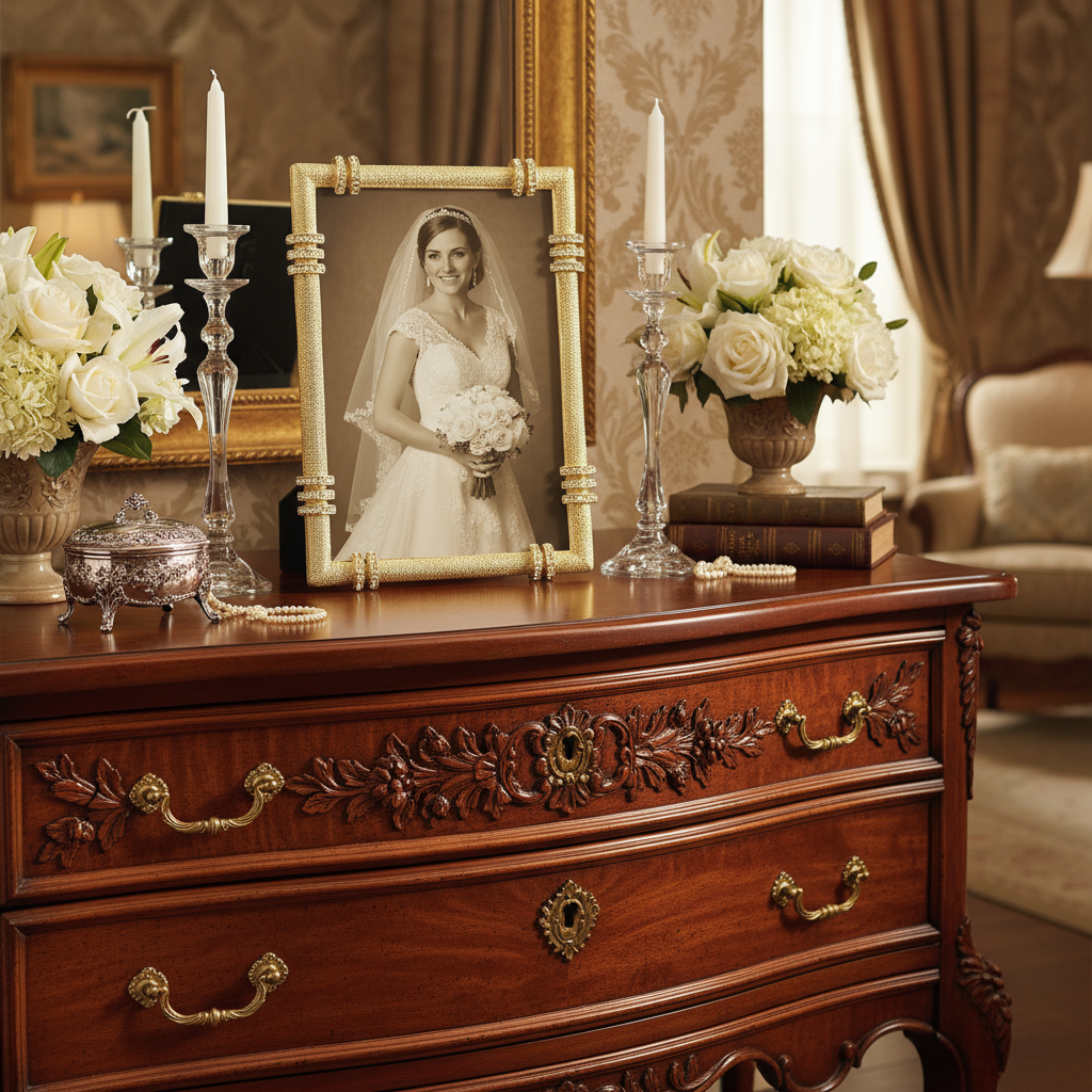 Channel-set clear European crystal banding in a cast pewter picture frame with textured gold or silver tone metal finish. Elegant moiré silk back with easel for vertical or horizontal placement. Beveled glass. Tarnish resistant. Signature luxury gift box included.