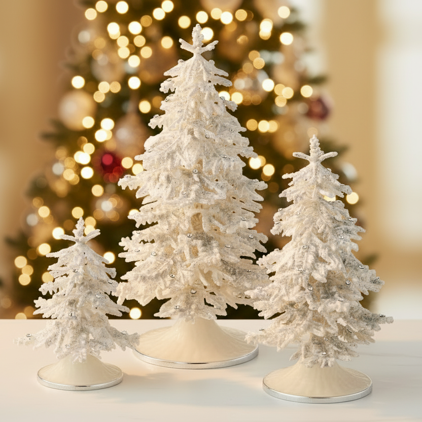 Three small decorative Christmas trees on a reflective surface with blurred lights in the background