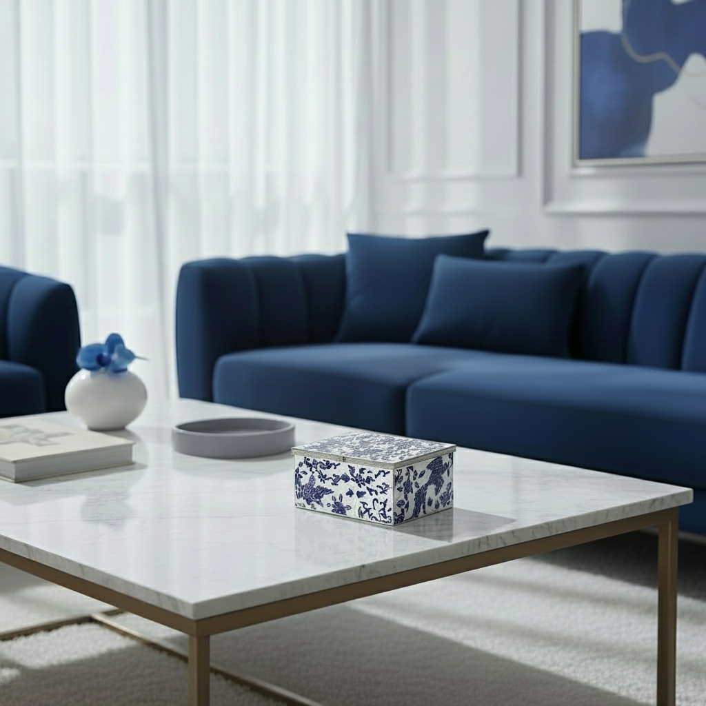 Celebrating a mythical creature, long associated with nobility and transformation. Silver finished pewter chinoiserie pattern box, with intricate hand-enameling in blue and white hues. Hinged lid and hand-enameled interior. Tarnish resistant. Signature luxury gift box included.