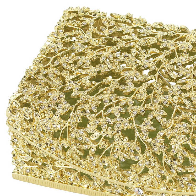 Contemporary intricate gold or silver finished pewter branch patterned box, adorned with hand-set clear European crystals. Hinged lid. Light blue or celadon hand-enameled interior. Tarnish resistant. Signature luxury gift box included.