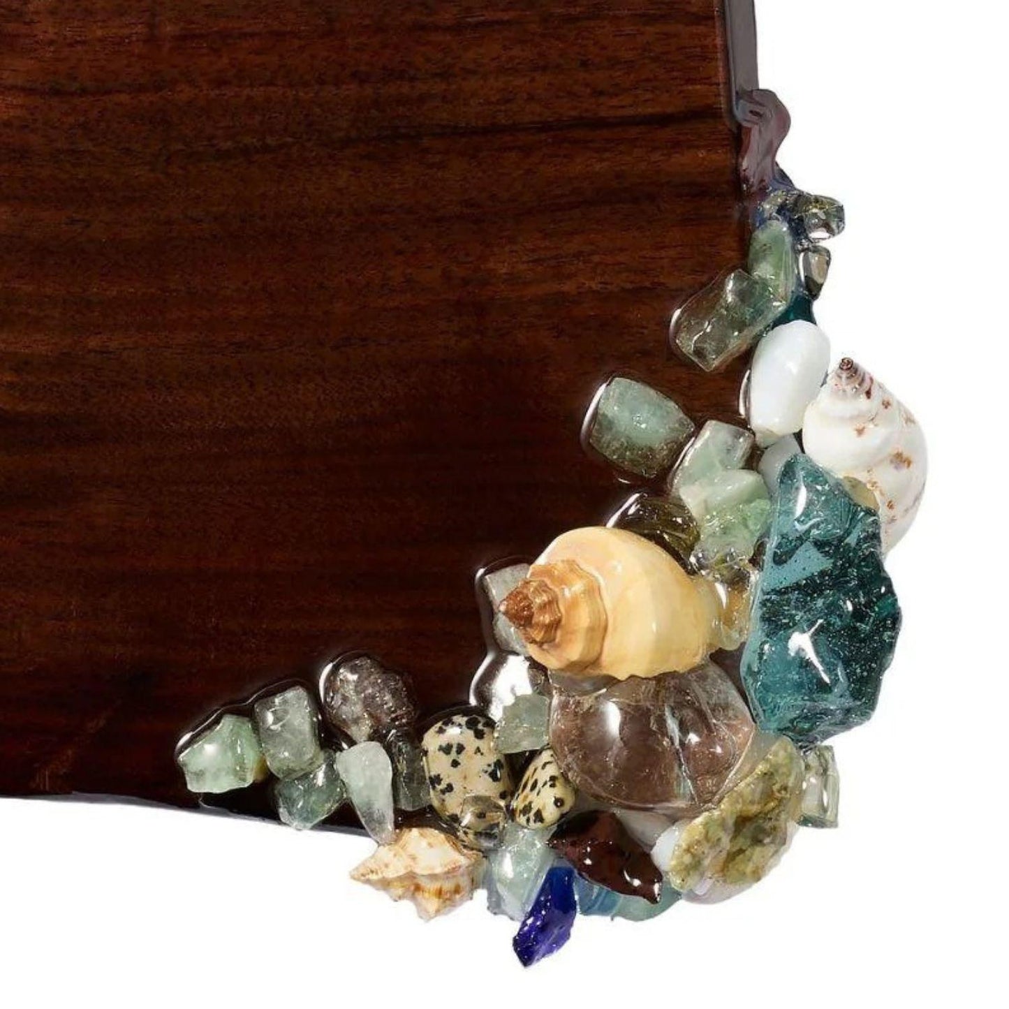 The Coastal pattern's multi-colored adornment includes a selection of glass, sea shells, and natural minerals, such as, clear quartz, rose quartz, selenite, aventurine, and jasper. Dust bag included.