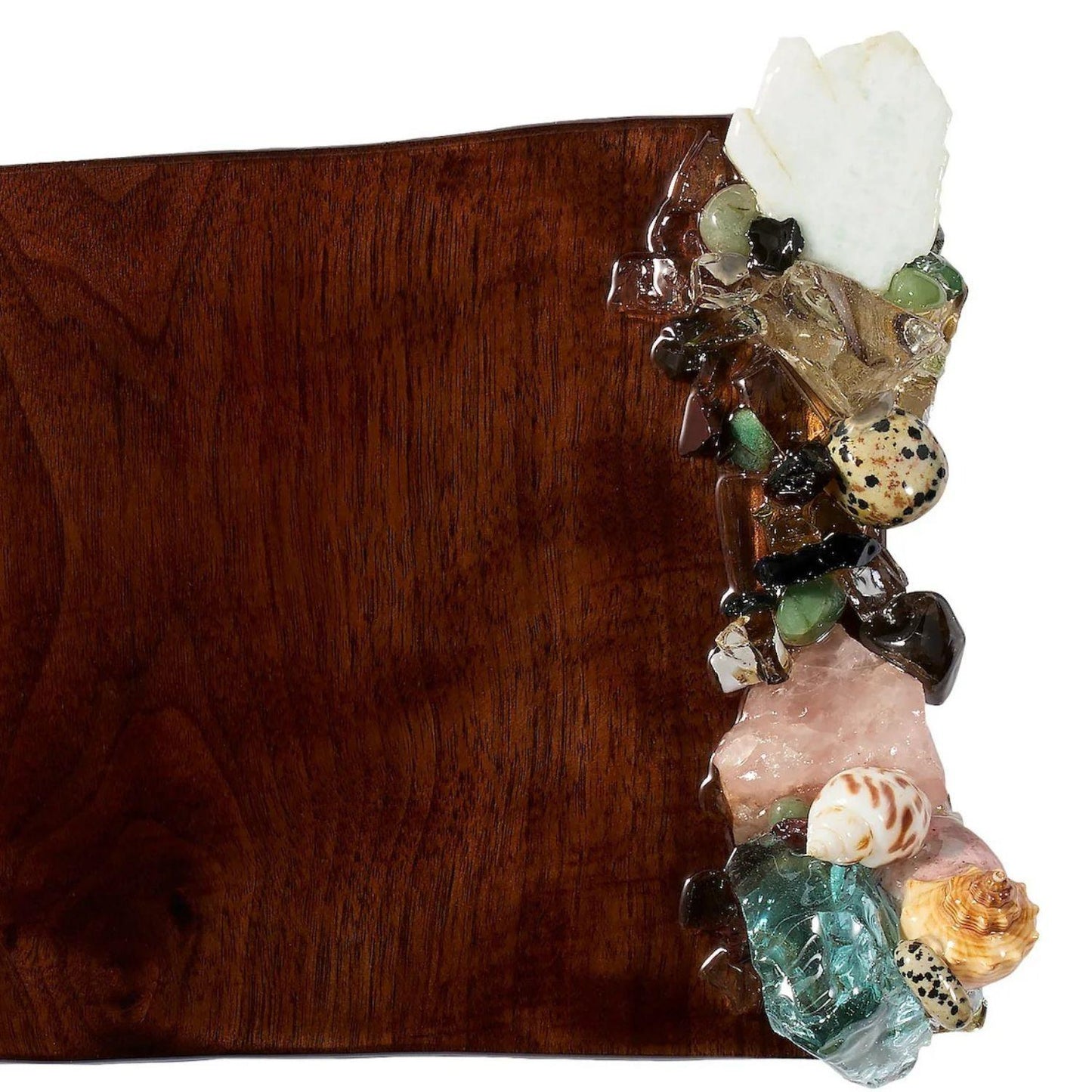 The Coastal pattern's multi-colored adornment includes a selection of glass, sea shells, and natural minerals, such as, clear quartz, rose quartz, selenite, aventurine, and jasper. Dust bag included.