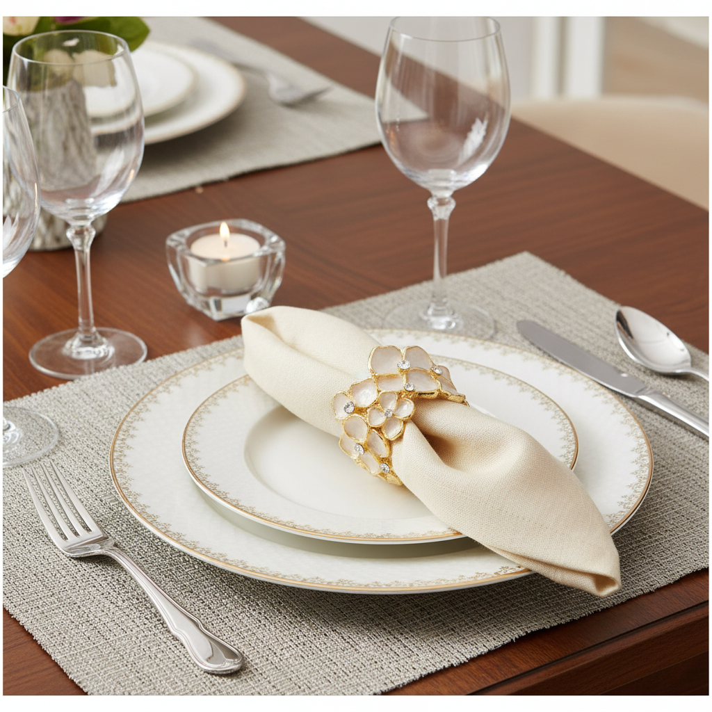 Delicate dogwood blossoms richly cast in gold finished pewter napkin rings with intricate ivory hued hand-enameling and hand-set clear European crystals. Tarnish resistant. Set of 4 napkin rings presented in signature luxury gift box.