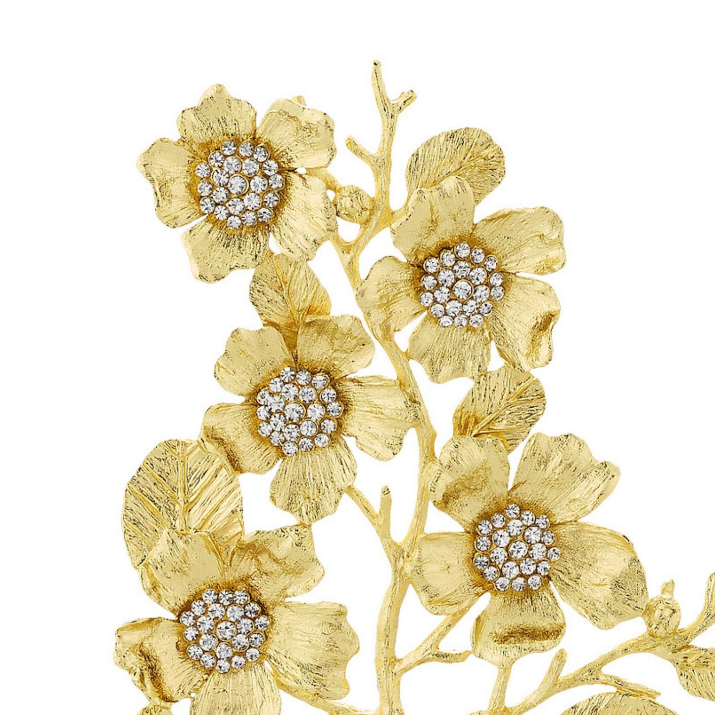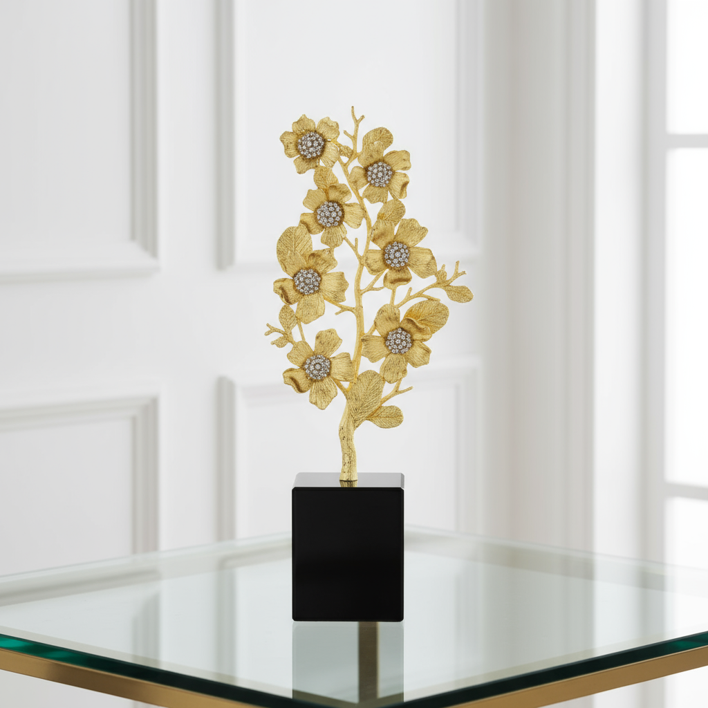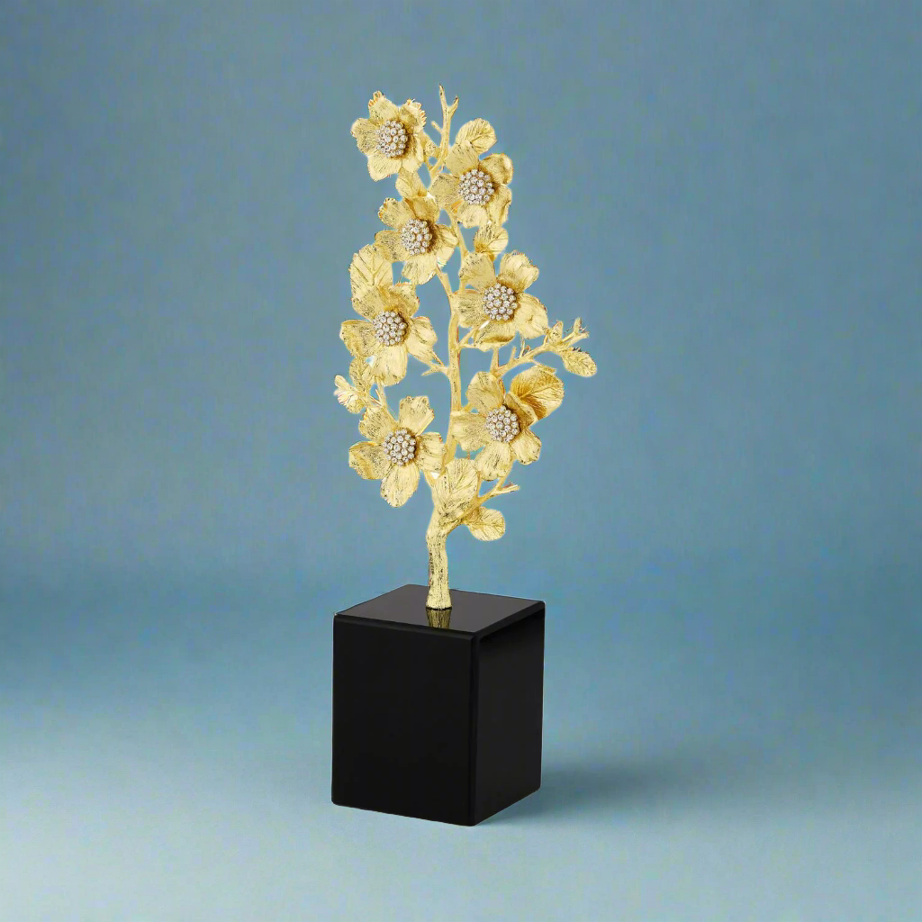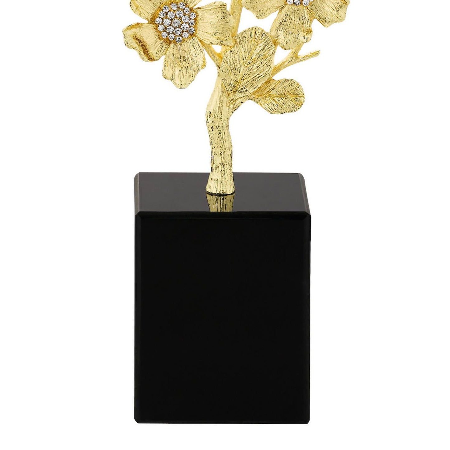 Depicting a stylized bouquet of rugosa rose blossoms, this sculpture is richly cast by artisans in gold finished pewter and encrusted with hand-set clear pavé European crystals. Mounted on an elegant black marble base. Tarnish resistant. Signature luxury gift box included.