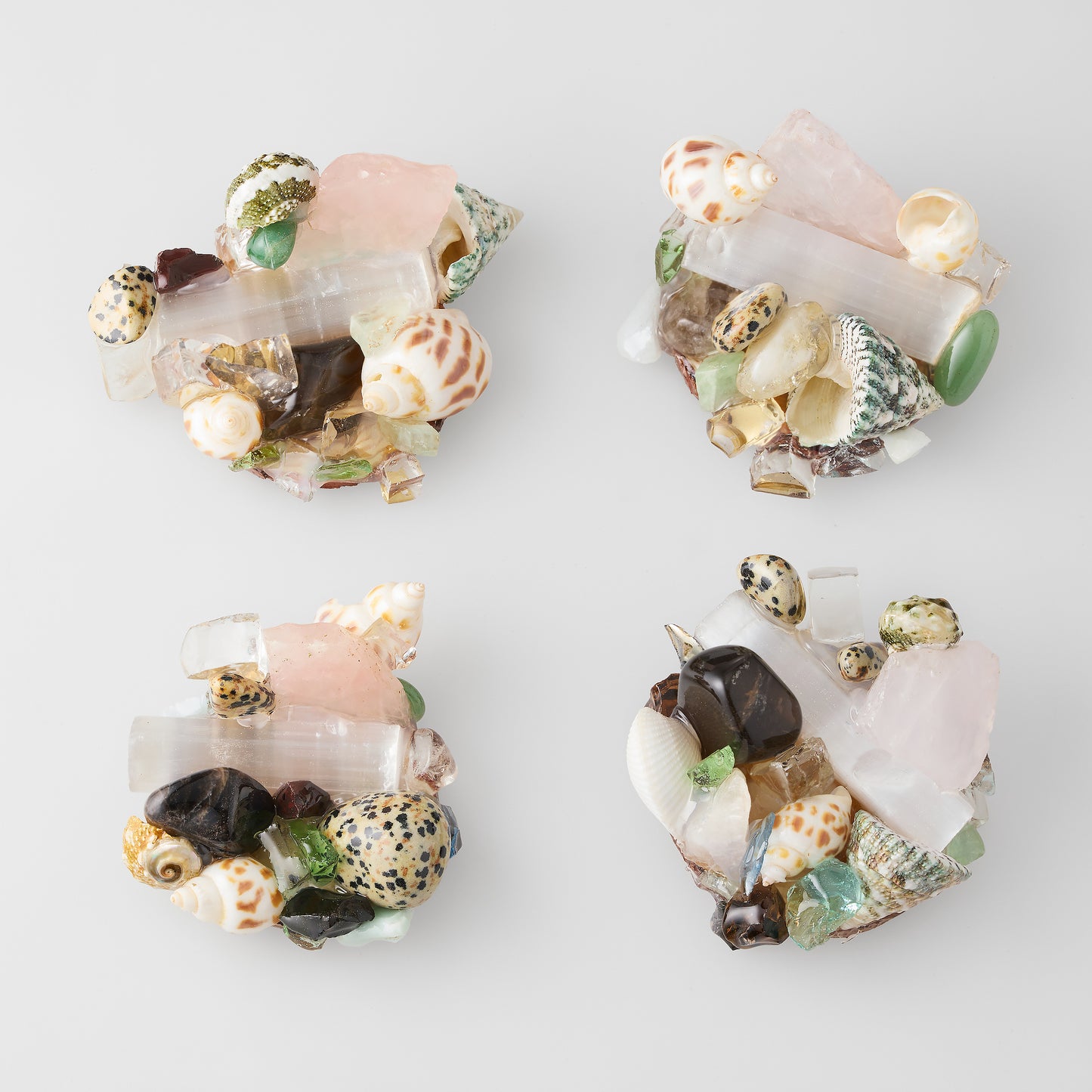 The Coastal pattern's multi-colored adornment includes a selection of glass, sea shells, and natural minerals, such as, clear quartz, rose quartz, selenite, aventurine, and jasper. Dust bag included.