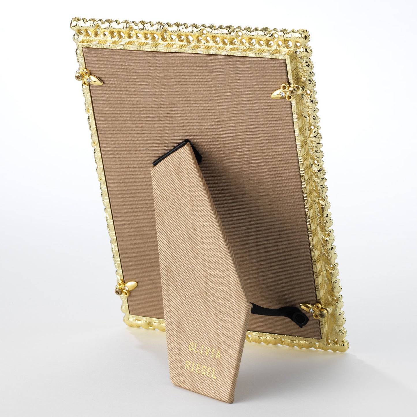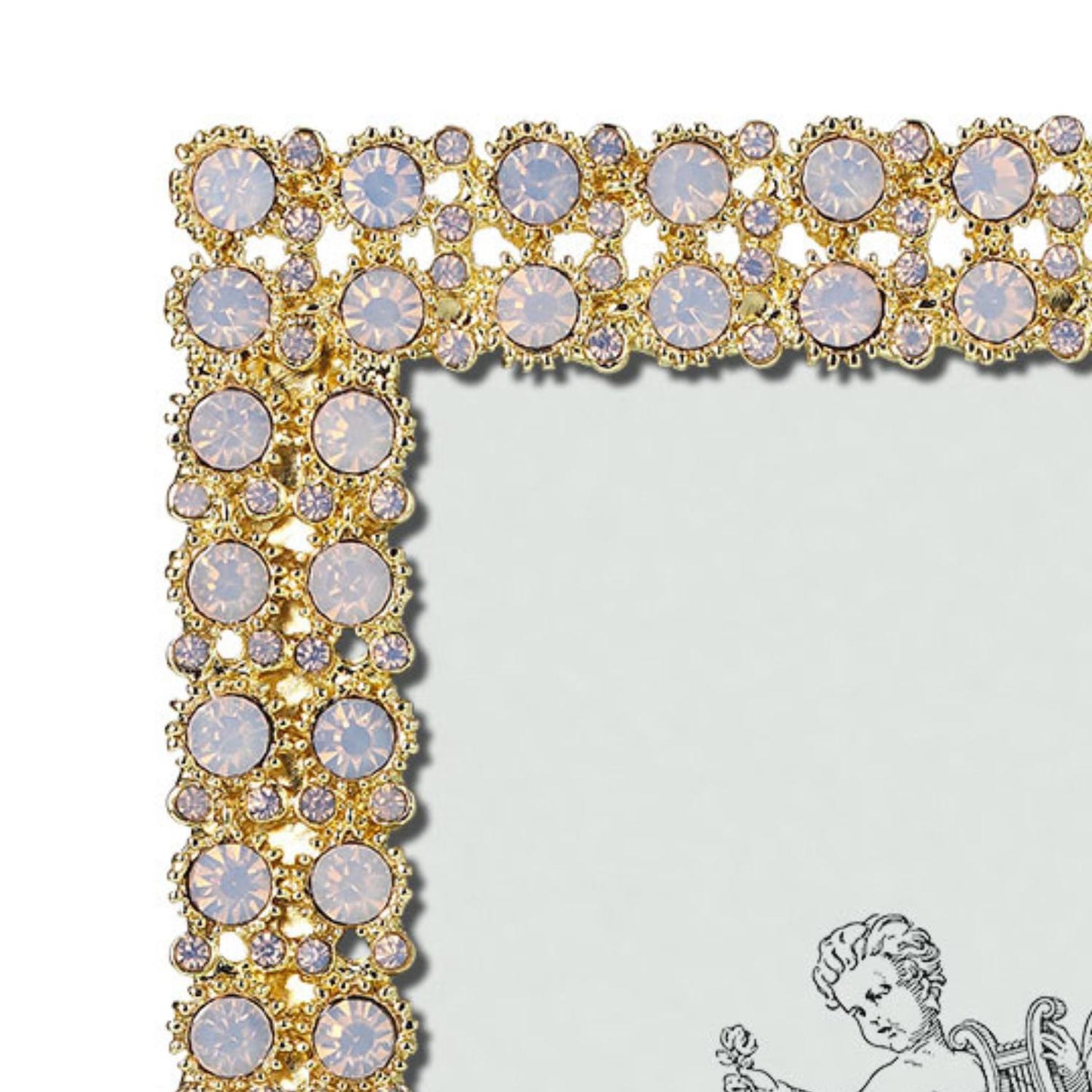Gold finished pewter, encrusted with hand-set pink opaline European crystals. Beveled glass. Elegant champagne moiré silk back, with easel designed for vertical or horizontal placement. Tarnish resistant. Signature luxury gift box included.