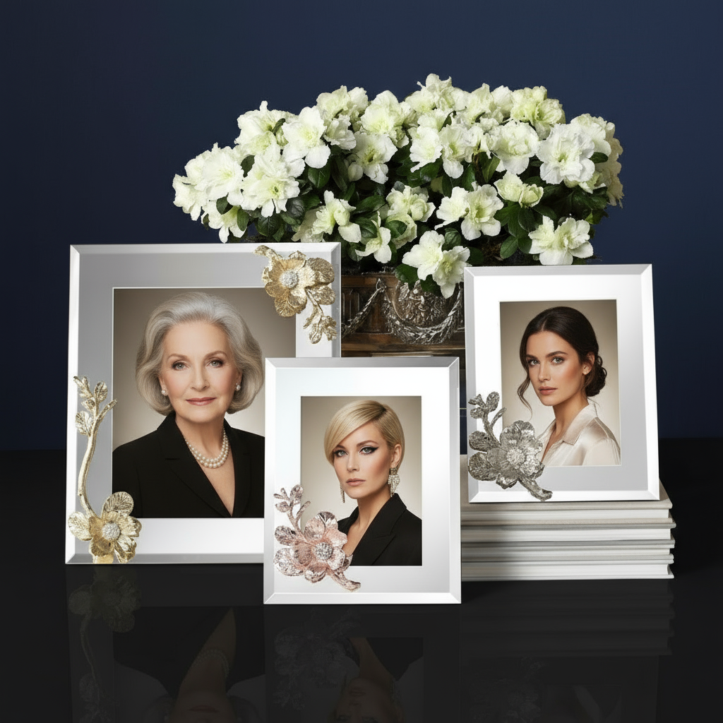 Beveled mirrored glass picture frame with gold or silver pewter blossom, inspired by the beautiful Rugosa Rose. Hand-set clear European crystals. Elegant moiré silk back, with easel designed for vertical or horizontal placement. Tarnish resistant. Signature luxury gift box included.