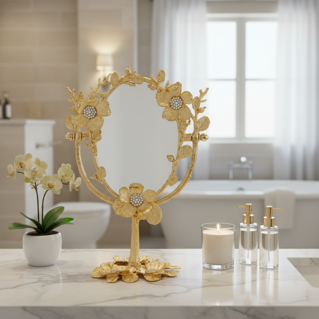 Inspired by the beautiful rugosa rose. Gold or silver finished pewter magnified vanity mirror/makeup mirror, encrusted with hand-set clear European crystals. Swiveling mirror design with 3x magnification. Elegant moiré silk back. Tarnish resistant. Signature luxury gift box included.