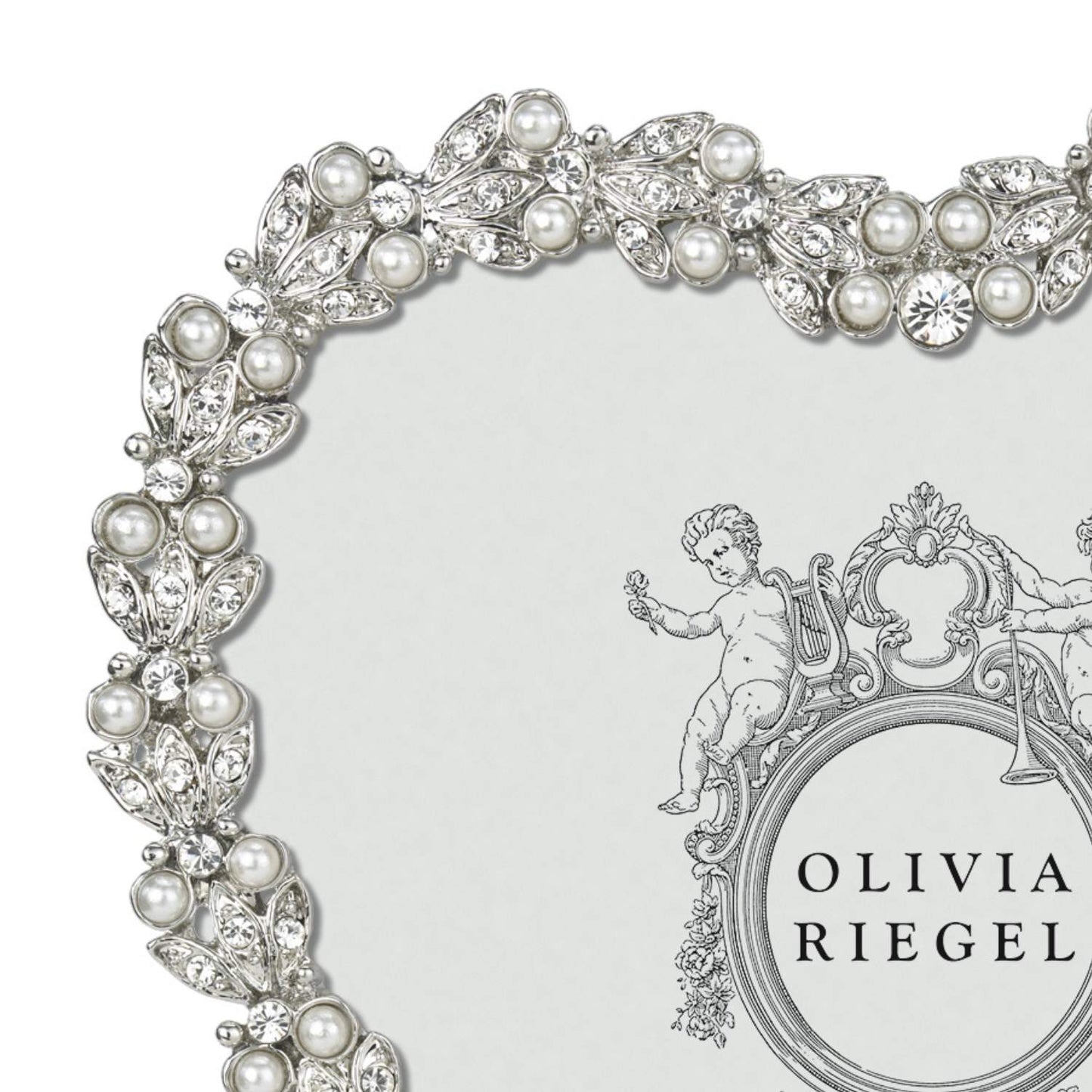Delicate silver or gold finished pewter picture frame with a heart design, adorned with hand-set clear European crystals and faux pearls. Elegant moiré silk back. Tarnish resistant. Signature luxury gift box included.