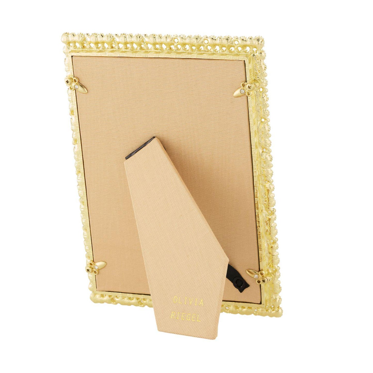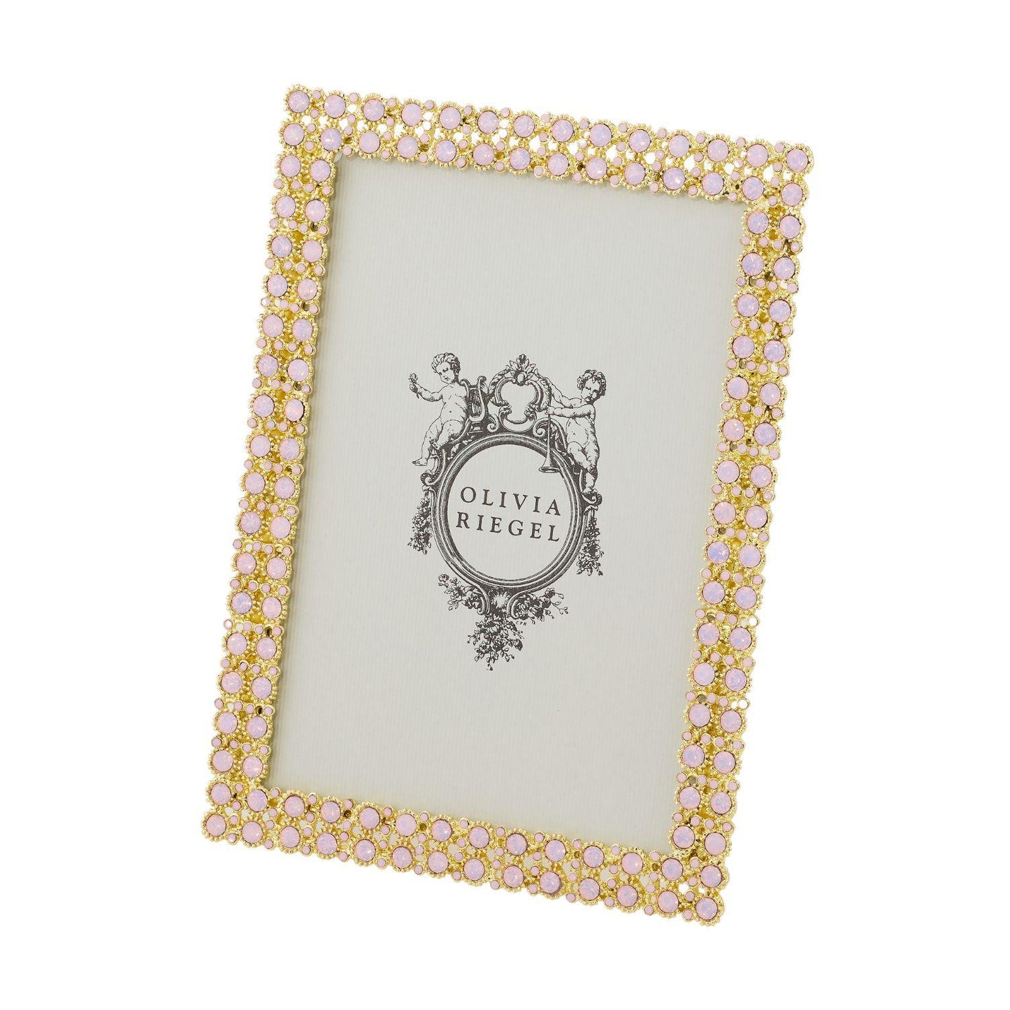 Gold finished pewter, encrusted with hand-set pink opaline European crystals. Beveled glass. Elegant champagne moiré silk back, with easel designed for vertical or horizontal placement. Tarnish resistant. Signature luxury gift box included.
