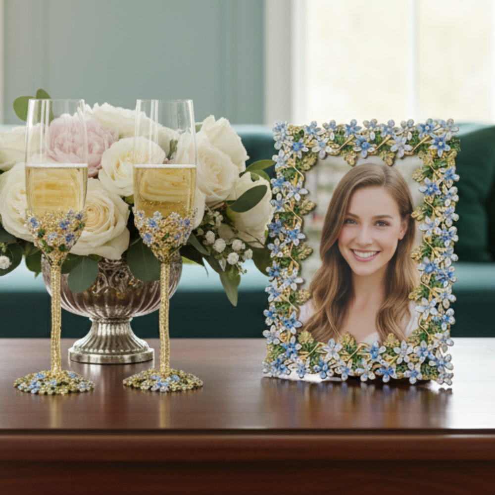 Celebrate garden enchantment with these bee and floral patterned champagne flutes. Gold finished pewter with intricate blue and green hued hand-enameling and hand-set clear European crystals. Tarnish resistant. Glass can be acid etched. Signature luxury gift box included.