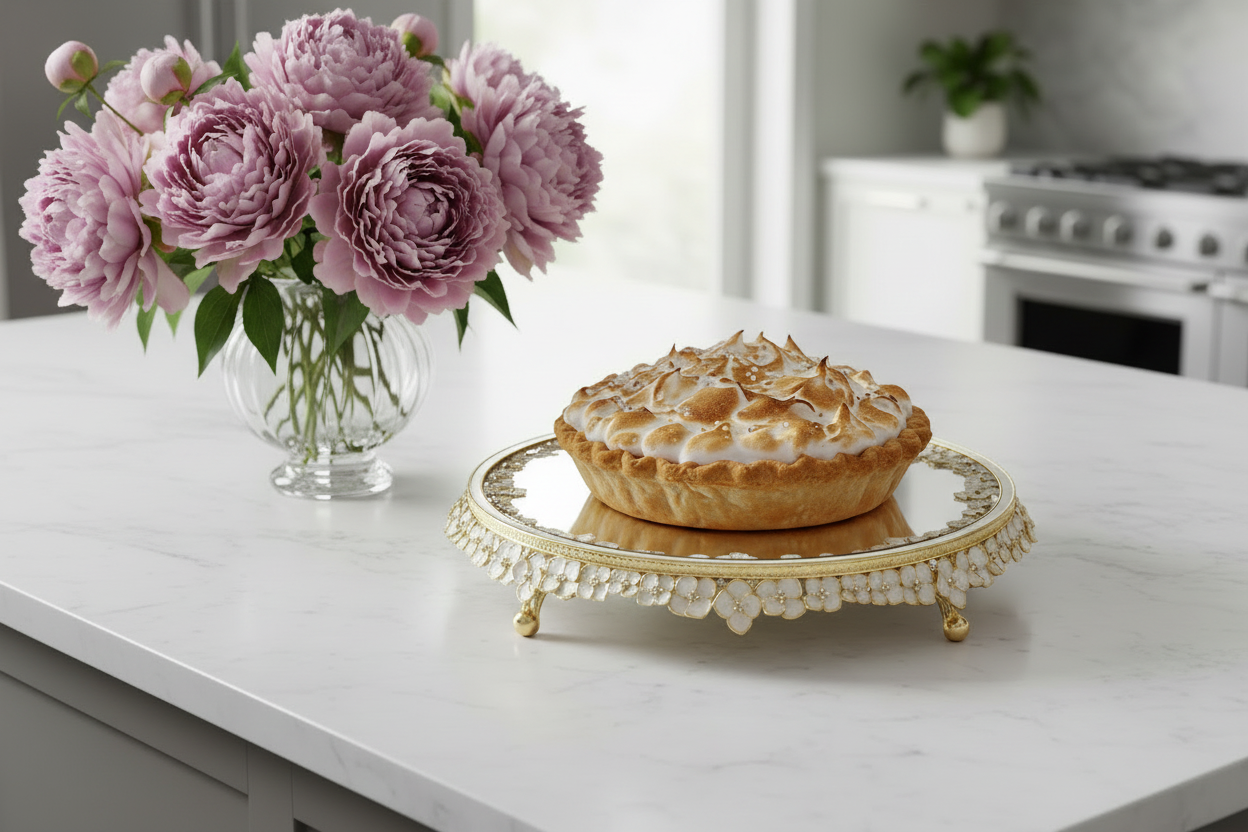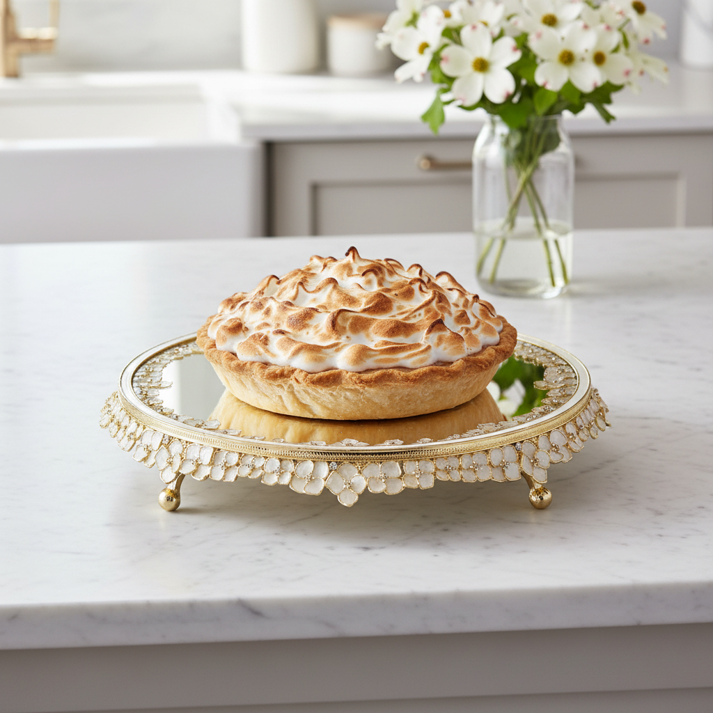 Delicate dogwood blossoms richly cast into a gold finished pewter cake stand, with intricate ivory hued hand-enameling and hand-set clear European crystals. Removable beveled clear glass top. Tarnish resistant. Signature luxury gift box included.