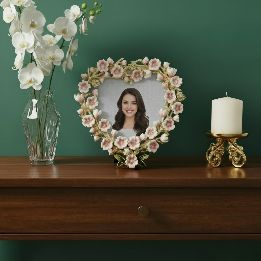 Delightful floral pattern picture frame in gold finished pewter, with pink and green hued hand-enameling and hand-set European crystals. Elegant champagne moiré silk back. Tarnish resistant. Signature luxury gift box included.