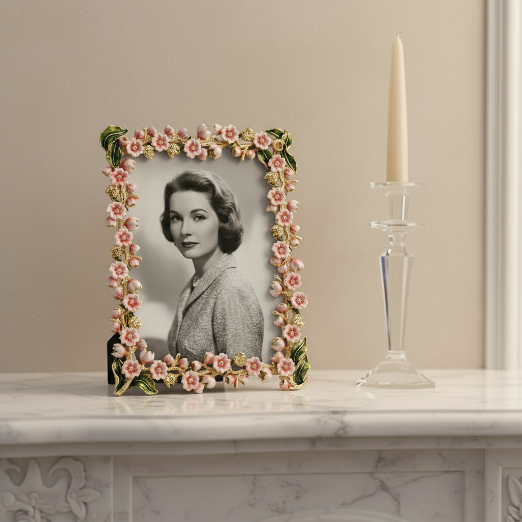 Delightful floral pattern picture frame in gold finished pewter, with pink and green hued hand-enameling and hand-set European crystals. Elegant champagne moiré silk back with easel for vertical or horizontal placement. Tarnish resistant.