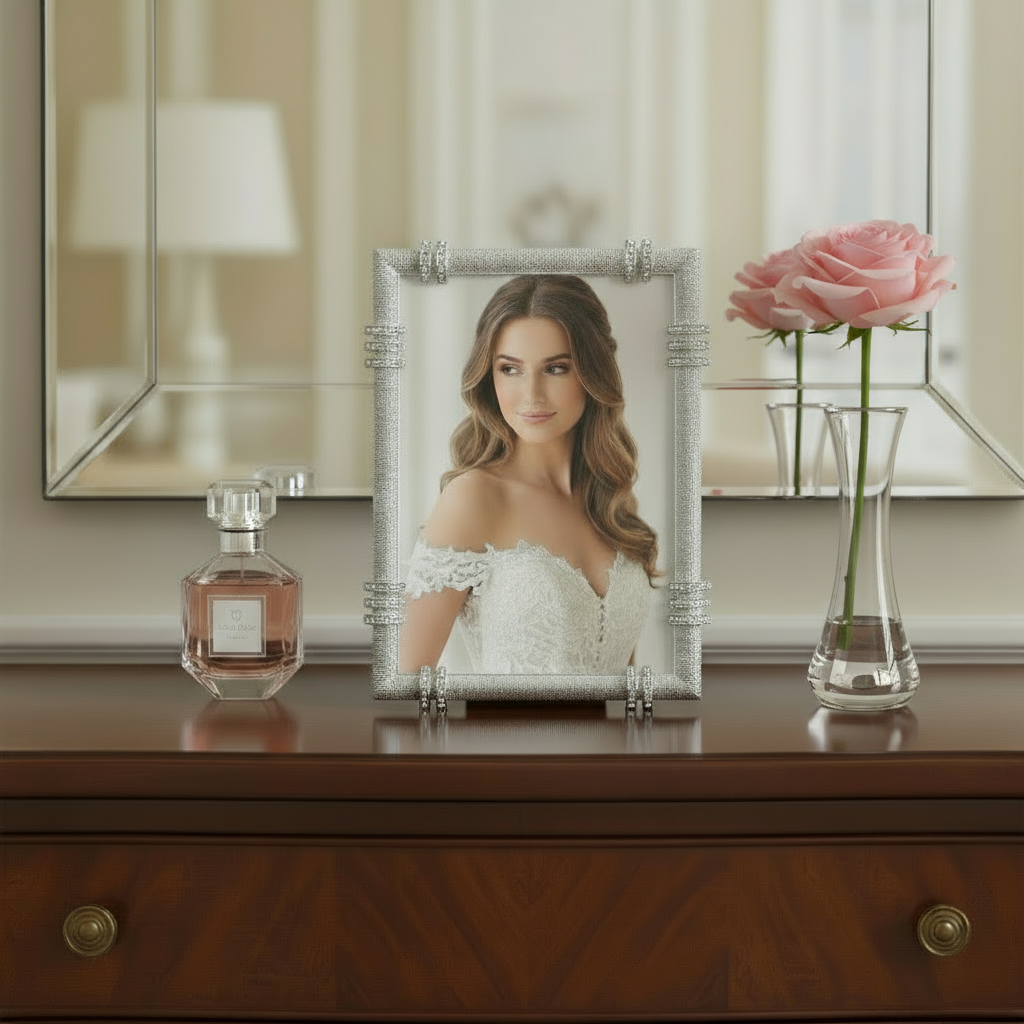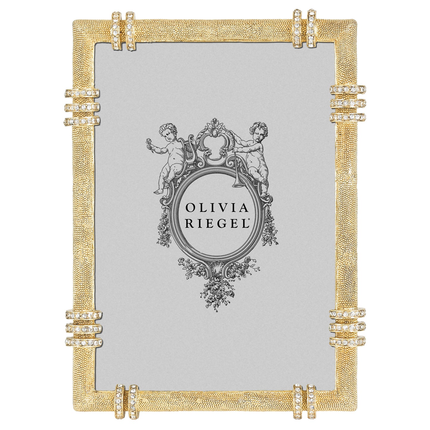 Channel-set clear European crystal banding in a cast pewter picture frame with textured gold or silver tone metal finish. Elegant moiré silk back with easel for vertical or horizontal placement. Beveled glass. Tarnish resistant. Signature luxury gift box included.